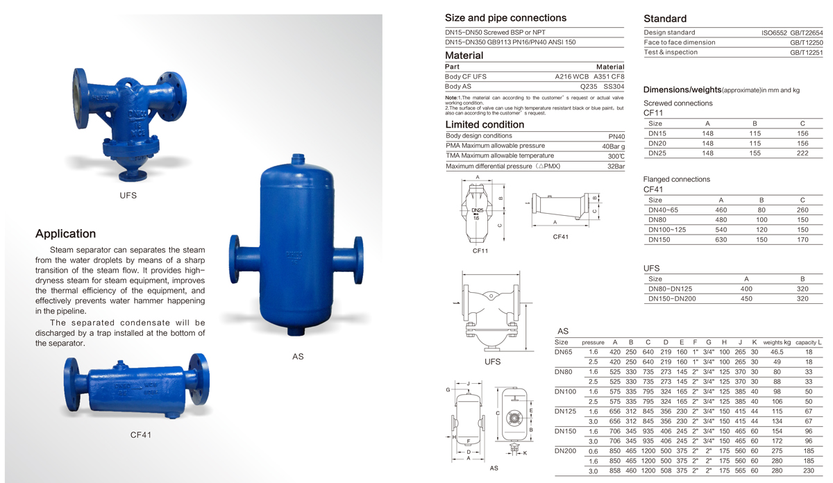 汽水分離器為壓力容器結構碳鋼或不銹鋼設備,須安裝于水平管線上,排水口垂直向下,所有口徑的汽水分離器均帶安裝支架,以減小管道承載。為確保被分離的液體迅速排放,應在分離器底部的排水口連接合適的一套疏水閥組合。 汽水分離器用于蒸汽、壓縮空氣及其它氣體系統(tǒng)可除去蒸汽、空氣或氣體等系統(tǒng)中所含水分。本類閥門在管道中一般應當水平安裝