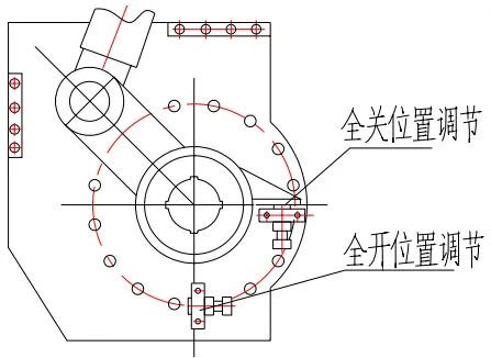 (3)蝶閥全開位置的調整(出廠時已調好,如有變動需重調):調整方法見圖(2),先將全開位置調節(jié)螺栓向上調節(jié),待蝶板全開(即活塞桿全部伸出到位)后再將螺栓向下調節(jié),頂緊連桿消除機械連接的間隙,然后緊固螺母即可